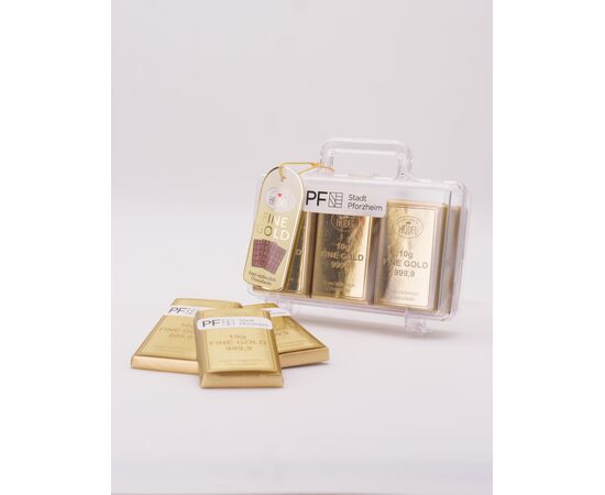 Kostbare Geschenkidee gefällig? Unser Gold-Koffer ist mit 12 einzeln verpackten Mini-Tafeln in Goldbarren-Optik aus zartschmelzender Edel-Vollmilchschokolade gefüllt. Das Präsent ist eine köstliche Anlage, die sich nach dem Naschen auch als Spardose weiter verwenden lässt.