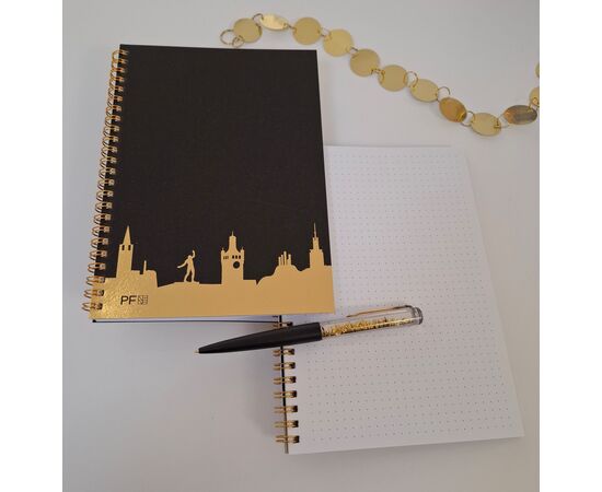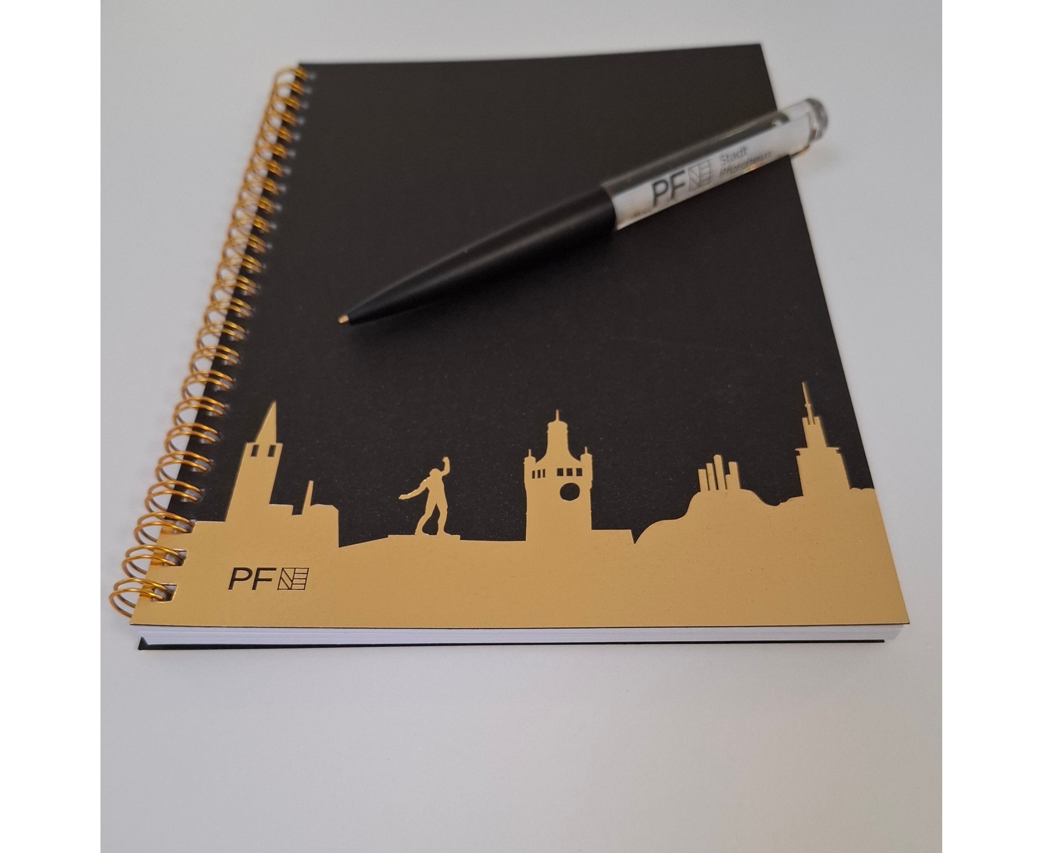 In dem praktischen Pforzheimer Notizblock mit Schwarzem Cover und dem hochwertigem Goldenen Skyline Aufdruck, hast Du die Möglichkeit deine wichtigsten Notizen, Ideen und Ziele festzuhalten. Dafür hast Du auf 40 gepunkteten Gitterpapieren Platzfreiheit. Passend dazu gibt es noch unseren Skyline Kugelschreiber. Auch über unseren Online-Shop zu bestellen.