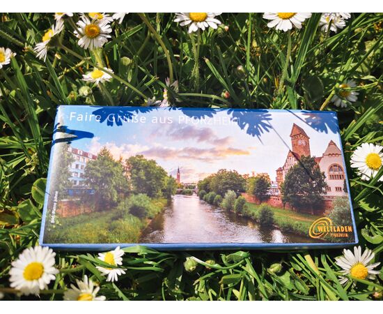 Verschenke faire Grüße aus Pforzheim. Die fair gehandelte Schokolade erlaubt Schokifans das Schlemmen ohne schlechtem Gewissen! Du hast die Qual der Wahl, denn die leckere Vollmilch-Schokolade ist erhältlich mit verschiedenen Stadtansichten.