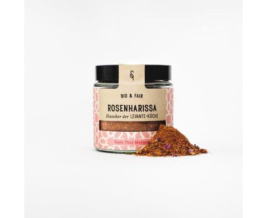 Rosenharissa die scharfe Gewürzmischung von Soulspice mit Rosenblüten bringt Magie in viele Brat und Schmorgerichte, Eintöpfe, Dips und Salate. Das samtige Aroma der Rosenblüten sorgt für eine harmonische Verbindung zwischen der Chili-Schärfe und den Aromen des Harissas. So können Lavante Fans die rosigen Noten Jerusalems und die würzige, nordafrikanische Küche auf den Teller zaubern. Ein Muss für Ottolenghi-Fans.