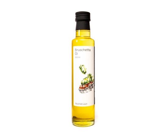 Das mediterrane Bruschetta Öl von Gourmet Leon schmeckt besonders gut zu Tomaten mit Mozzarella oder Fetakäse. Super lecker auch auf frisch geröstetem Brot. Das Bruschetta Öl zaubert italienisches Flair zu würziger Marinade für Grillfleisch oder Fisch.