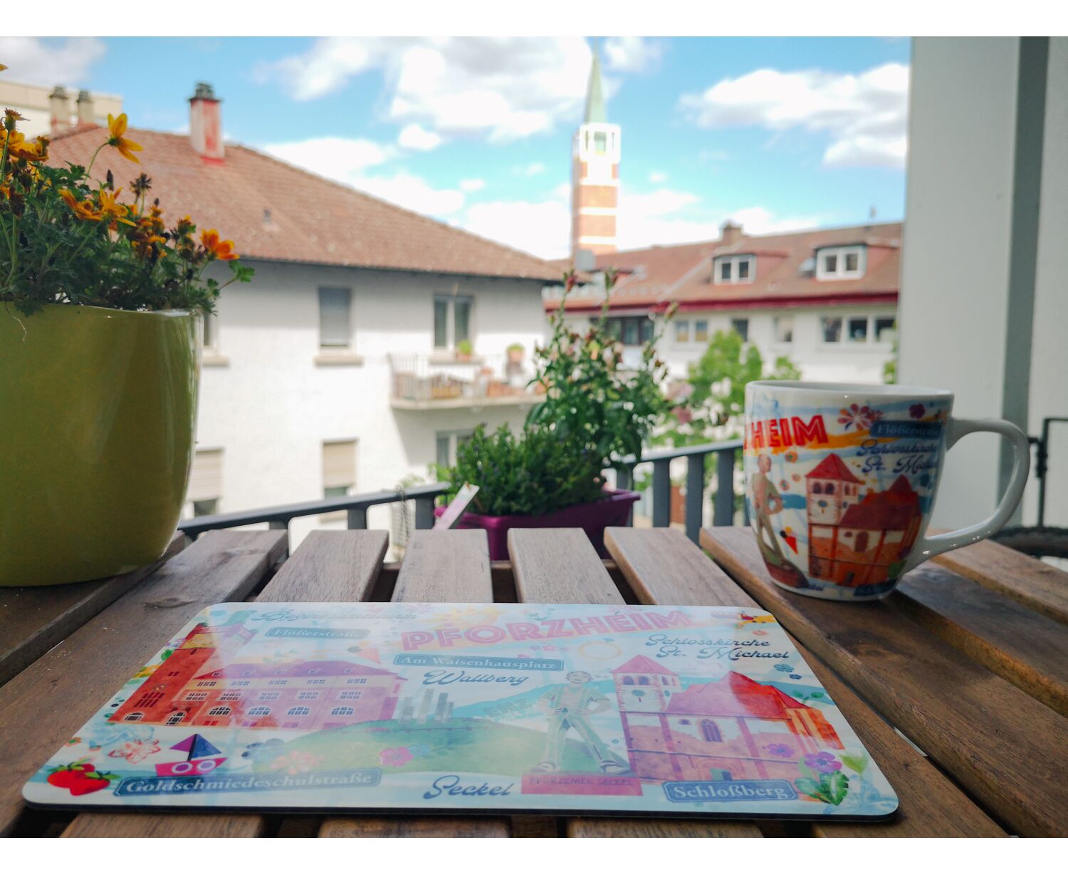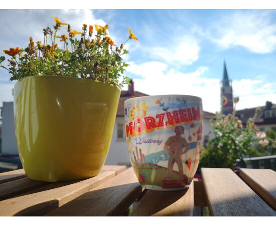 Die große Tasse ist nicht nur ein Hingucker auf jedem Tisch mit ihrem spielerischen Streetart Design, sondern auch perfekt für jede Tee- und Kaffeepause. Abgebildet sind bekannte Gebäude der Stadt, wie der Bezirksamtsturm oder die Schloßkirche St. Michael. Natürlich dürfen auch der Pforzemer Seckel und der Wallberg nicht fehlen. Des Weiteren befinden sich Pforzheim typische Straßennamen auf dem Design. Die Porzellantasse ist spülmaschinen- und mikrowellengeeignet und hat ein Fassungsvermögen von ca. 430 Milliliter. Mit dieser Tasse hat man selbst bei schlechtem Wetter Sonne im Herzen und gute Laune, 13,95€ (Preis pro Stück)