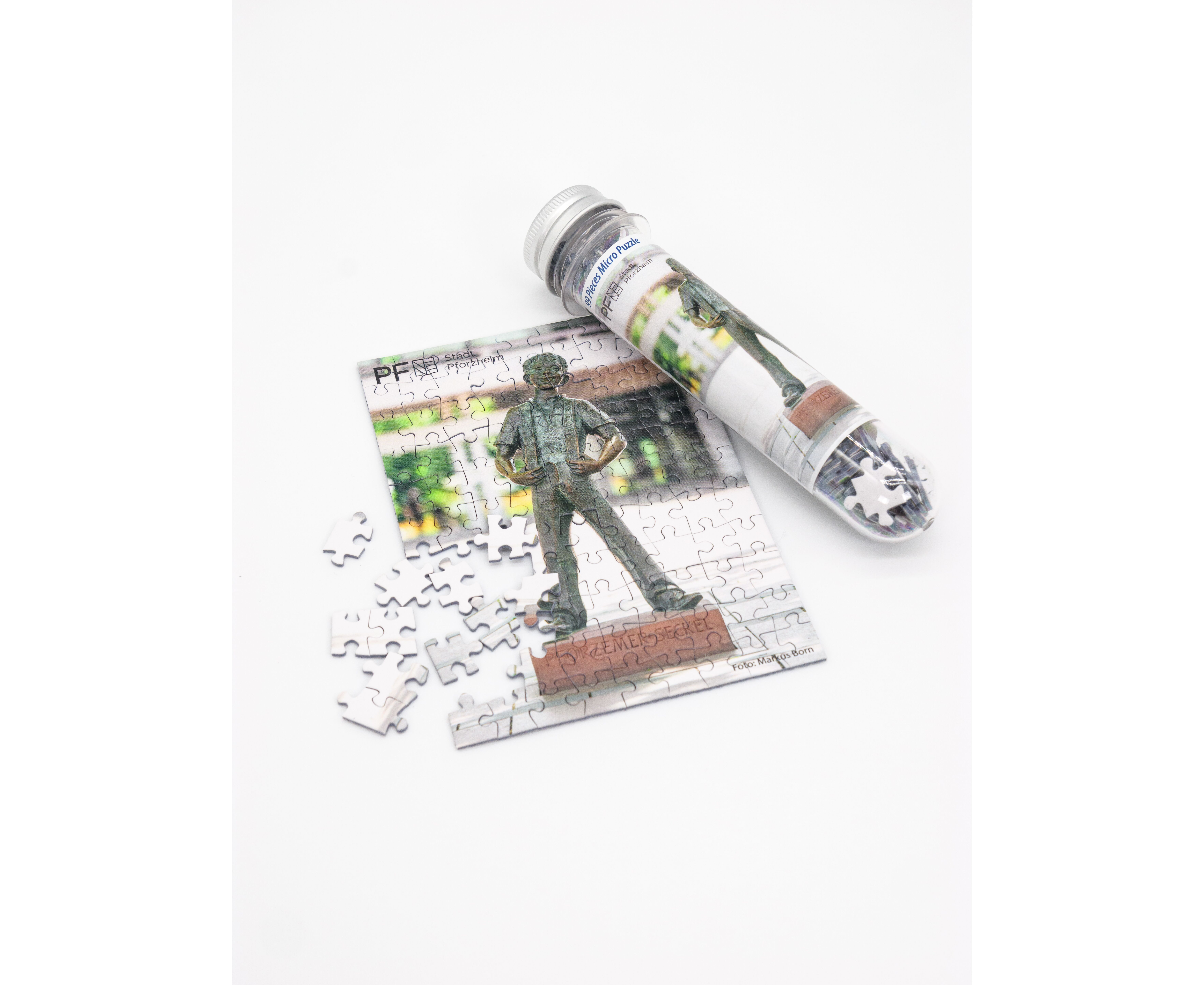 Schon gewusst? Pforzheim gibt es auch im Reagenzglas! Nämlich als 99-teiliges Puzzle im Micro-Format (10x14cm). Hierbei stehen Dir der „Pforzheimer Seckel“ und eine wunderbare Sicht auf den Schlossberg und die Schlosskirche St. Michael aus der Vogelperspektive als Motiv zur Wahl. Das Ganze wird jeweils in einem dekorativen Reagenzglas mit Schraubdeckel aufbewahrt. Mit der handlichen Größe und dem hübschen Design, hast Du immer ein kleines Stück der Goldstadt mit dabei und kannst es in jeder noch so kleinen Tasche verstauen.
